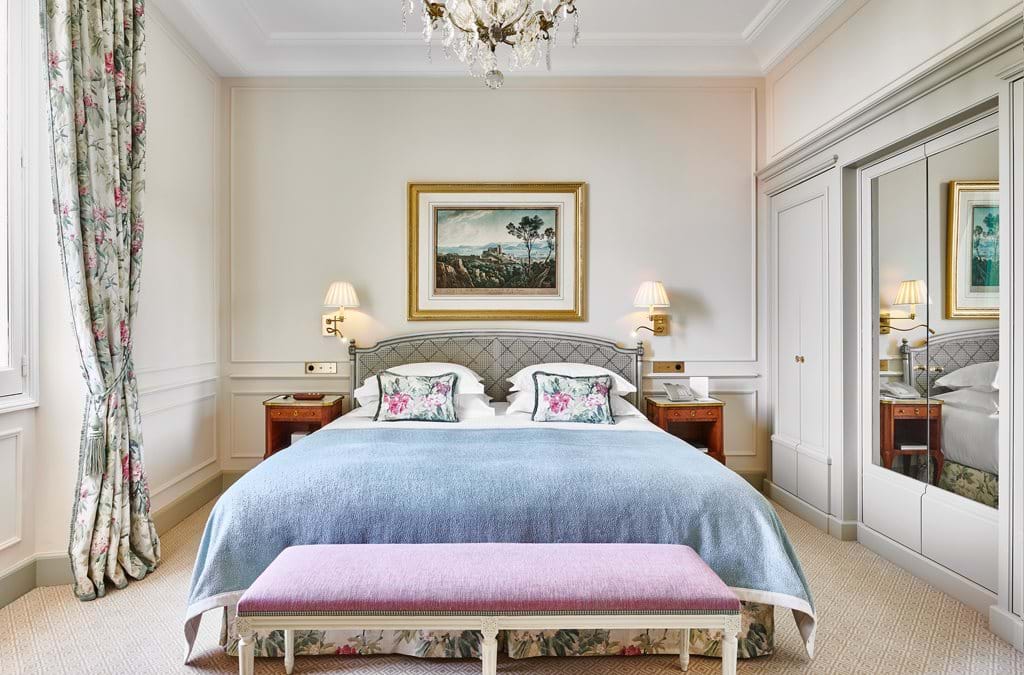 Eden Roc suite (90 кв. м): терраса (200 кв. м) с джакузи на открытом воздухе, гостиная, спальня, гардеробная, 2 ванные комнаты. Расположен на верхнем этаже в корпусе Eden-Roc Pavilion. Вид на море и Леринские острова.